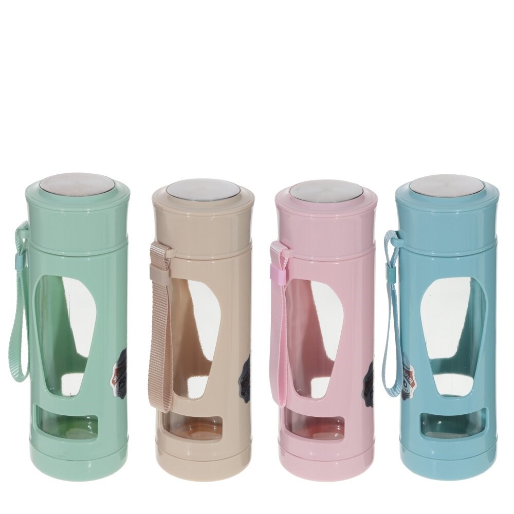 Стеклянная бутылка объемом 500 мл. достаточно удобная и полезная вещь, отличный аксессуар для активного отдыха и прогулок. Завинчивающаяся крышка пластиковая оснащена ремешком. Представлена в 4 вариантах