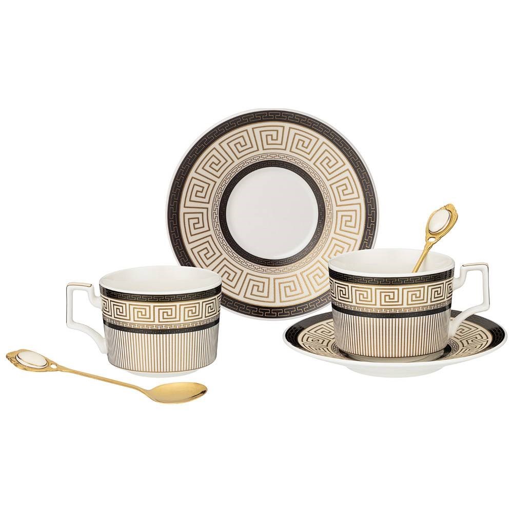 Коллекция "Elegance" ТМ LEFARD - это современная классика. Ритмичный динамичный рисунок, элементы греческого орнамента, сочетание белого, черного и золотого цветов создают атмосферу сдержанной красоты и изысканности. Изделия выполнены из упрочненного фарфора. Сверкающее глянцевое покрытие. Ваш стол неотразим! Посуда прошла сертификацию. Безопасна для контакта с пищевыми продуктами. Можно использовать в микроволновой печи. Рекомендуется применять мягкие средства для мытья в посудомоечной машине. Комплектность: 2 чашки 250 мл, 2 блюдца, 2 чайный ложки