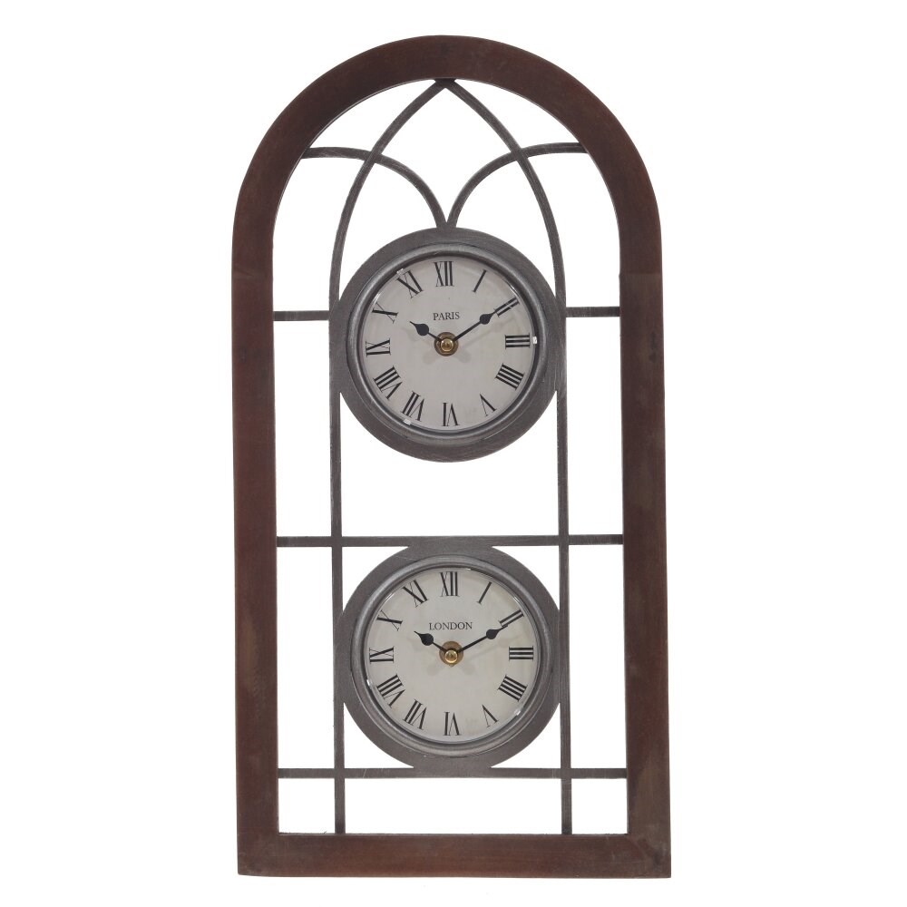 Оригинальные настенные часы с двумя циферблатами отлично выглядят в интерьере и дополняют его. Циферблаты часов круглые диаметром 10 см, с арабскими цифрами. Стрелки: часовая, минутная, секундная. Механизм: кварцевый. Питание: две батарейки типа АА (в комплект не входят).