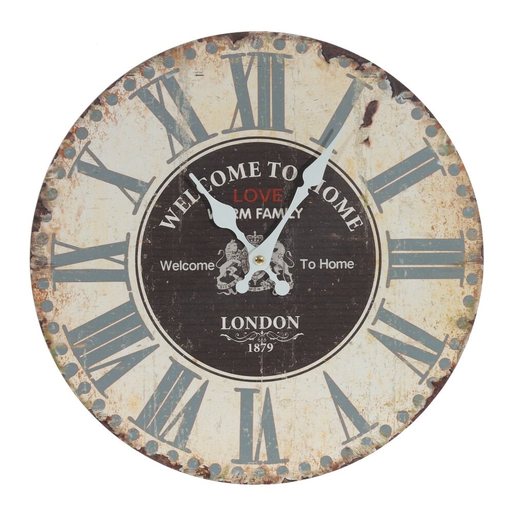 Часы настенные декоративные. Две стрелки - часовая, минутная. Механизм кварцевый. Диаметр циферблата: 33 см, цифры - римские. Работают от одной батарейки типа "АА" ( в комплект не входит). С задней стороны есть крепление на стену.