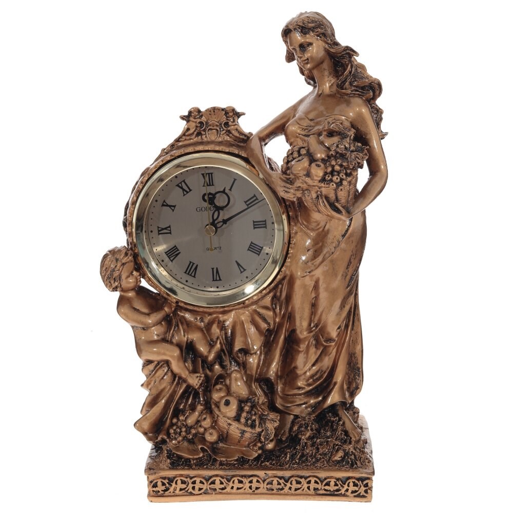 Часы настольные декоративные, украшенные фигуркой девушки, - привлекательная деталь, которая точно украсит и освежит любой интерьер. Эти часы послужат не только для того, чтобы показывать время, но и могут стать предметом гордости Вашего дома. Часы имеют кварцевый механизм, три стрелки - часовая, минутная, секундная. Цифры римские. Работают от батарейки типа АА - 1 шт (в комплект не входит). Диаметр циферблата: 9 см.