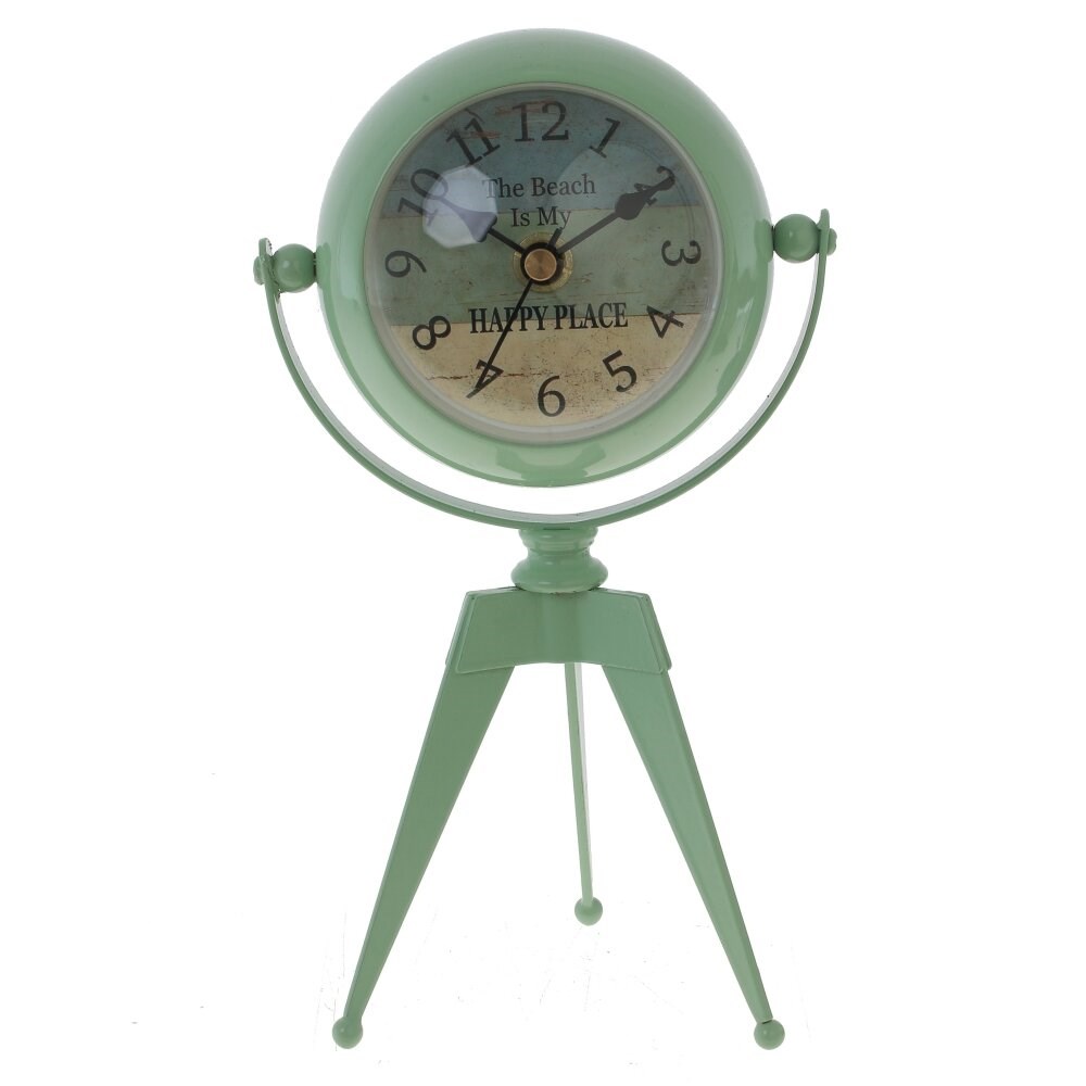 Металлические настольные часы мятного цвета, на трех ножках, с обратной стороны имеют небольшое зеркальце. Круглый циферблат часов диаметром 6,5 см. с арабскими цифрами, имеет три стрелки: часовую, минутну, секундную. Работает от батареек AA 1 шт. (в комплект не входят)
