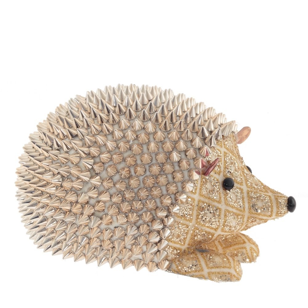 Прекрасная новогодняя фигурка Ежа золотого цвета. На праздничном столе, каминной полке или подоконнике рядом с еловыми шишками и ветками придаст вашему интерьеру праздничный уют.