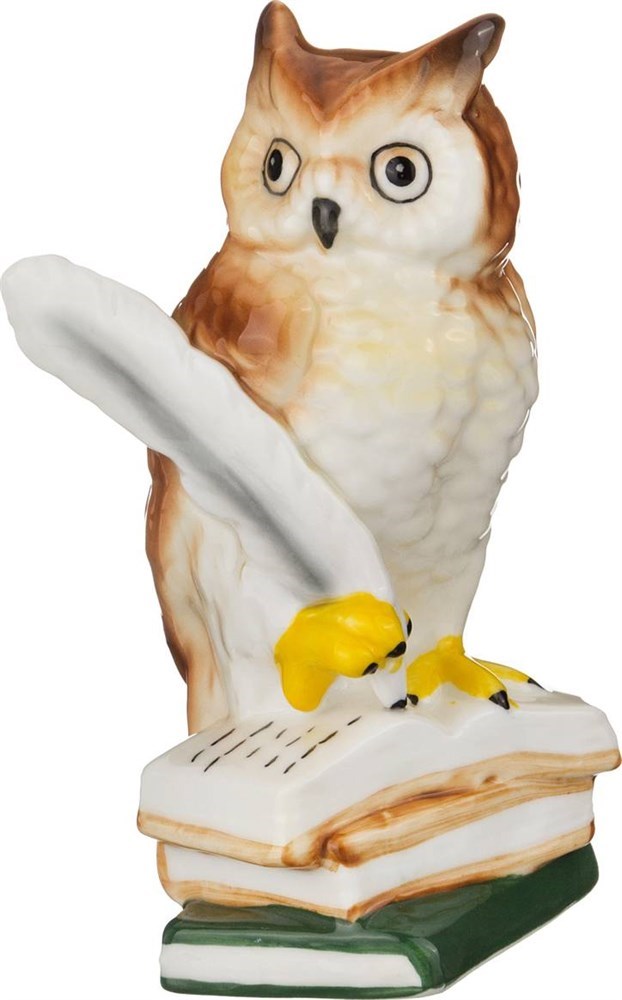 Изображение совы выполнено с высокой степенью точности, каждая деталь вырисована с особым вниманием к деталям и качеству. Фигурка выполнена из качественного фарфора. Сова изображена на стопке книг, что подчеркивает её мудрость и неистощимые знания, а также держит перо в лапе, что ассоциируется с творческой душой и богатым воображением.