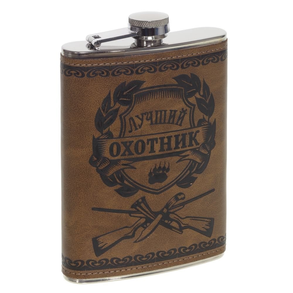 Дизайн и отменное качество делает эту фляжку желанным подарком для любого мужчины. Изготовлена из нержавеющей стали, декорирована экокожей с надписью "Лучший охотник" и тематическим рисунком. Закручивающаяся крышечка крепится к основанию горлышка, что делает невозможным её потерю, но в то же время не мешает сделать глоток прямо из фляги. Объем: 250 мл.