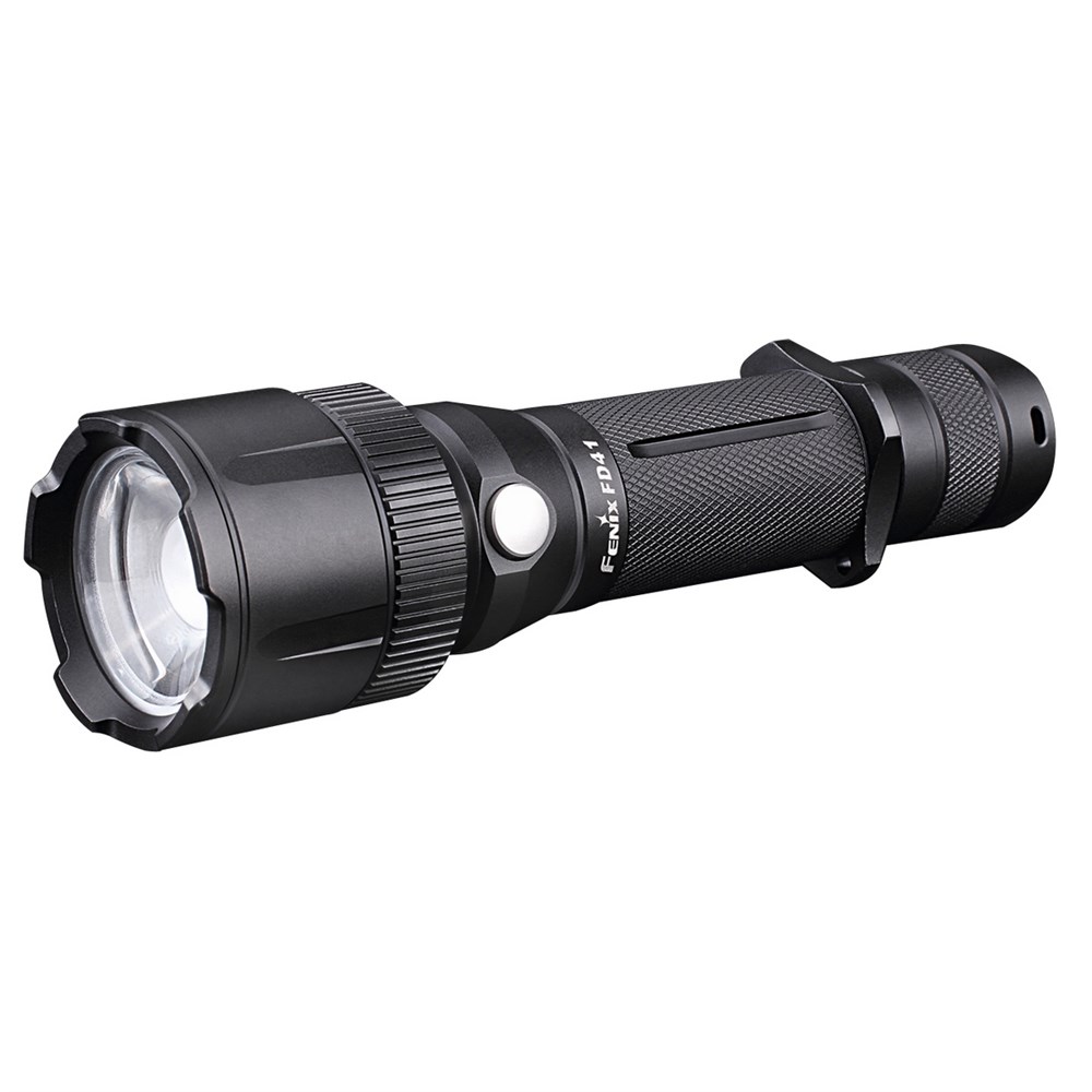 Фонарь Fenix FD41 Cree XP-L HI LED ANSI Режим Турбо Высокий Средний Низкий Strobe Яркость 900 люмен 350 люмен 150 люмен 10 люмен 900 люмен Время работы 1 час 40 минут 3 часа 50 минут 10 часов 15 минут 150 часов - Дистанция Сфокусированный свет 340 м 218 м 141 м 37 м - Рассеянный свет 47 м 30 м 20 м 6 м - Ударопрочность 1 м Водонепроницаемость IPX-8 (погружение до 2м) Размеры 146 мм (длина) 40 мм (диаметр головы) 25.4 мм (диаметр корпуса) Вес 160 г (без элементов питания) Комплектация фонарь, шнур для переноски, чехол, тактическое кольцо, запасное уплотнительное кольцо, резиновая накладка на кнопку, инструкция, гарантия Элементы питания 1x18650 или 2хCR123A Тип отражателя Гладкий Материал корпуса Авиационный алюминий Тип оптической системы Отражатель Покрытие корпуса Анодирование Premium Type 3 Упаковка Коробка Включение Кнопка Переключение режимов Кнопка на торце Описание фонаря Fenix FD41 Cree XP-L HI LED: Бренд Fenix представил еще одну модель фонаря, среди функций которого имеется регулировка фокусного расстояния луча вручную. Это Fenix FD41, оснащенный мощным диодом Fenix FD41. На его базе, этот фонарь в состоянии давать луч яркостью 900 люмен. Модель работает в четырех режимах яркости постоянного освещения и дополнительном режиме тактического назначения, который называется стробоскопом. Самый яркий режим называется Turbo. Его яркость равна 900 люмен и поддерживать ее фонарь сможет 1 час 40 минут (при условии, что емкость качественного аккумулятора 18650 будет равна 3500 мАч). При этом, дальность освещения пользователь может регулировать по собственному усмотрению в пределах 47-340 метров. Более чем в два раза дольше (3 часа 50 минут) Fenix FD41 сможет работать в режиме High, яркость которого равна 350 люмен. В этом случае, диапазон дальности луча составит 30-218 метров. Режим Mid предполагает яркость 150 люмен при длительности работы фонаря 10 часов 15 минут. Диапазон, в котором можно регулировать дальность освещения, - 20 — 141 метр. Самый экономный режим получил название Low. Его яркость — 10 люмен. Дистанция луча может составлять 6-37 метров, а время работы фонарика — 150 часов. Наконец, стробоскоп (яркие вспышки света) работает на максимальной яркости — 900 люмен. Что касается диапазона дальности луча, то он регулируется поворотом кольца, размещенного рядом с головой фонаря. Более сфокусированный луч лучше освещает расположенные вдали объекты, но он узкий, зато большой угол обзора обеспечивает луч с минимальной фокусировкой. Он отлично подходит для освещения сразу большого сегмента вблизи от пользователя. Такой перечень рабочих режимов позволяет выбрать наиболее удобный в любой ситуации, регулируя не только яркость света, но и ширину, а также дальность луча. Поэтому использовать Fenix FD41 удобно практически в любой ситуации. Надежности данной модели способствует и то, что производители оснастили фонарь полным комплектом защитных механизмов. Так, Fenix FD41 не страшны короткие замыкания вследствие переполюсовки, перегревание диода (фонарь автоматически уменьшит яркость, когда это необходимо для остывания), намокание даже под дождем или при полном погружении в воду. Корпус этого фонарика выполнен из легкого, хорошо защищенного от коррозии и очень прочного сплава алюминия. Для более высокого качества, он покрыт анодированию стандарта Premium Type 3. Этот корпус на 100% защищает все механизмы Fenix FD41 от ударов при падении с высоты равной одному метру, от попадания в