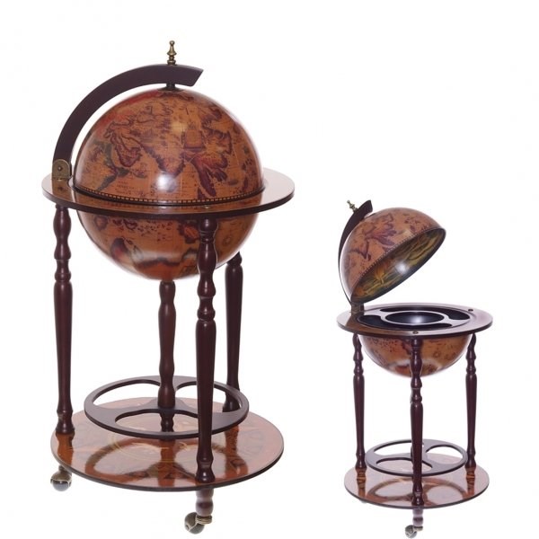 Напольный глобус-бар представляет собой предмет со специальными отделениями для хранения алкогольных напитков, а также фужеров. Это функциональное изделие и одновременно удобное, практичное и мобильное. Является украшением интерьера рабочего кабинета или гостиной комнаты.