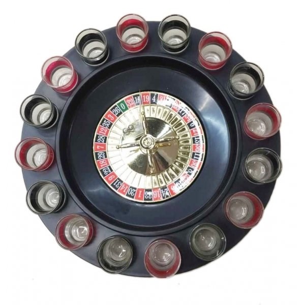 Игра настольная (питейная) "Рулетка" состоит из рулетки-подставки под рюмки, набора рюмок с номерами (8 черных, 8 красных), шарик. Участники этой игры отмечают каждый выигрыш стопкой крепкого алкоголя.