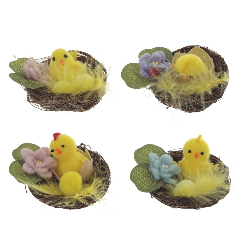 Это декоративное гнездо станет отличным украшением светлых пасхальных дней. Оно как нельзя лучше подходит к весеннему настроению и будет ярким пятном в интерьере. Состоит из искусственных цветов, зелени, декоративных яиц и фигурки цыпленка. Представлено в четырех вариантах.