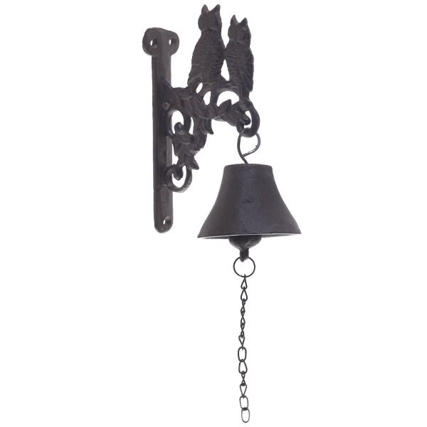 Чугунный колокольчик на дверь, украшенный фигурками сов, послужит достойным украшением интерьера. К язычку колокольчика прикреплена цепочка для подачи звукового сигнала.