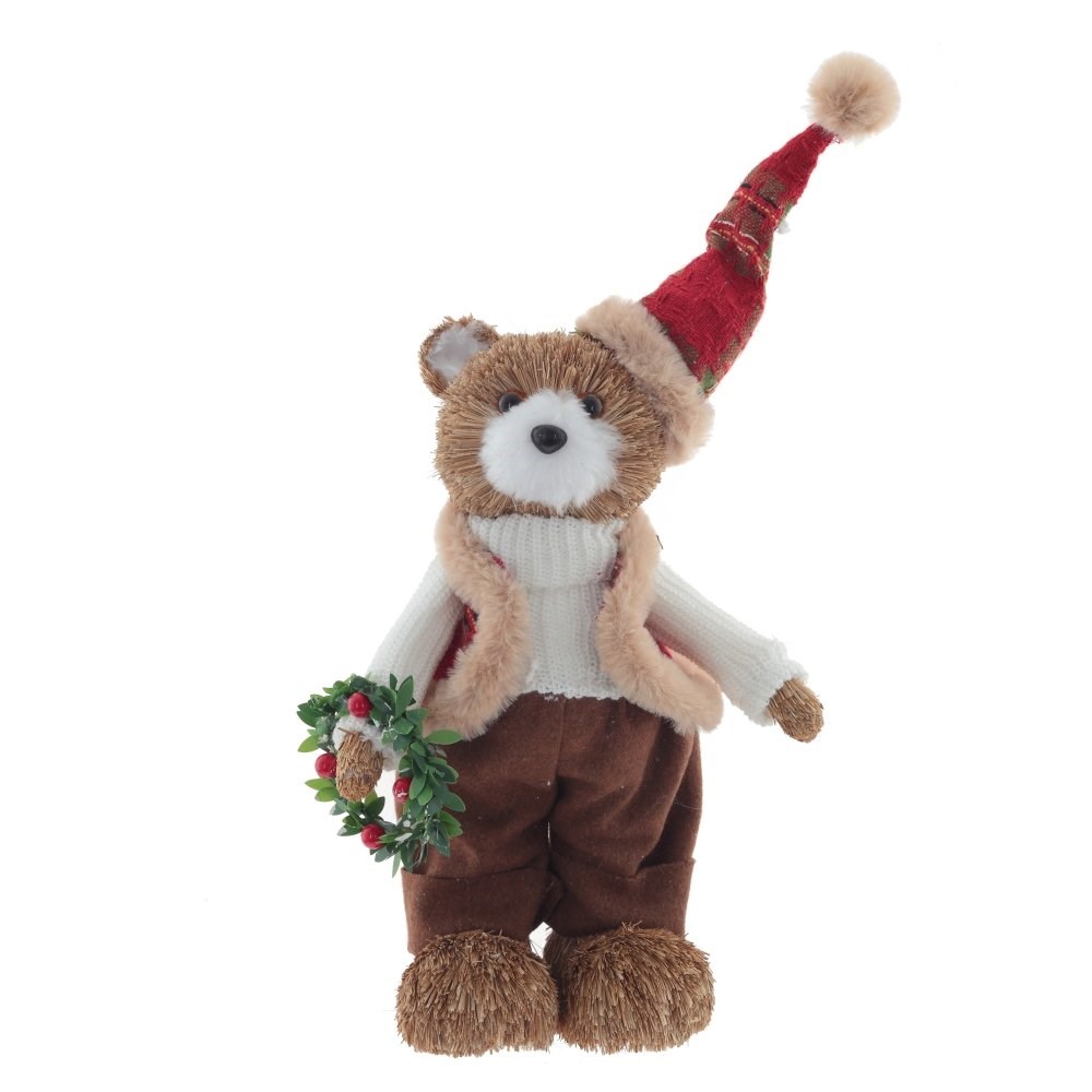 Декоративная новогодня фигурка из соломы. Медвежонок с в ярком костюмчике и колпачке, с еловым веночком в лапке.