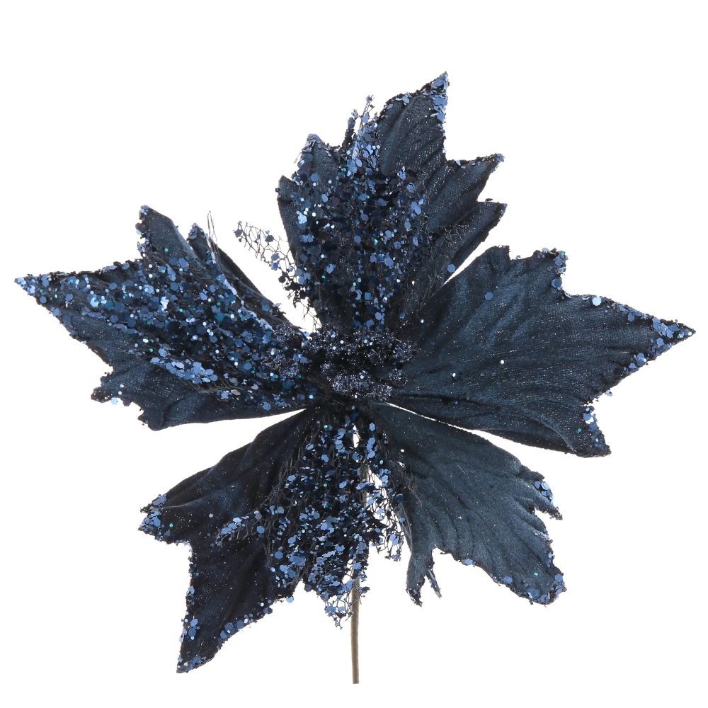 Искусственная пуансеттия смотрится очень волнующе, а усыпанные мелкими блестками лепестки сияют и переливаются от светящихся огоньков новогодней елки.