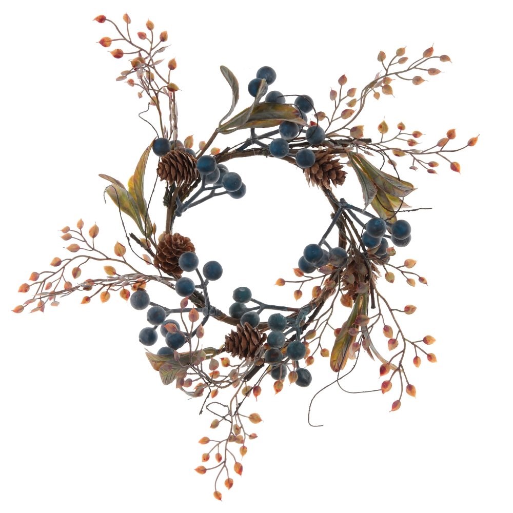 Этот роскошный венок сплетен из искусственных веток и декорирован ягодами голубики, листьями и шишками. Венок настолько хорош, что невозможно взгляд оторвать.