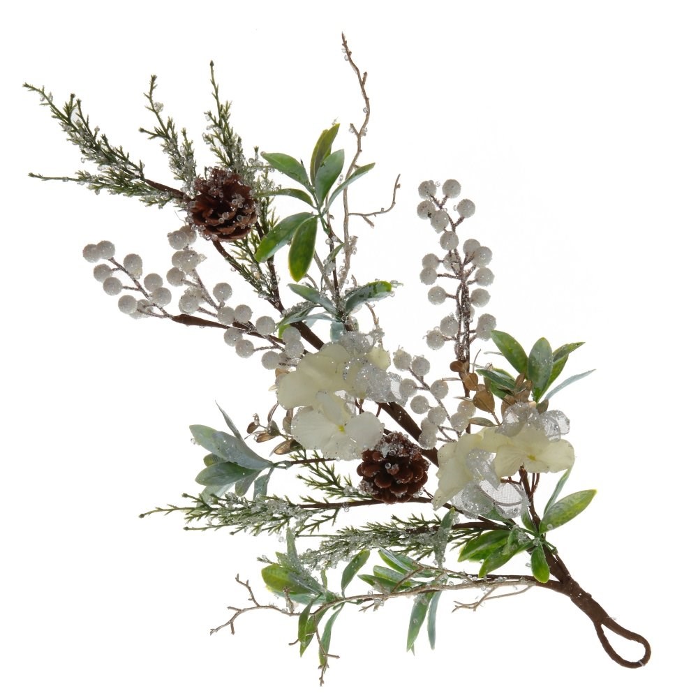 Ветка с листьями, цветами и шишками – настоящая находка для новогоднего декора. Станет отличным самостоятельным украшением, а также прекрасно впишется в любую праздничную композицию.