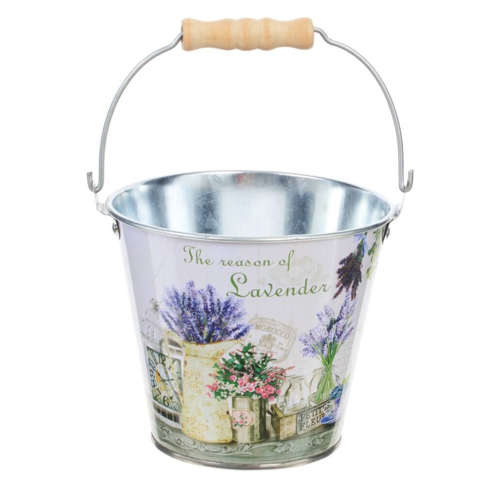 Такое кашпо для цветов в форме ведерка с удобной ручкой станет украшением любого участка, выделит растения из общего фона. Сосуд выполнен из металла и дополнен нежным цветочным рисунком.