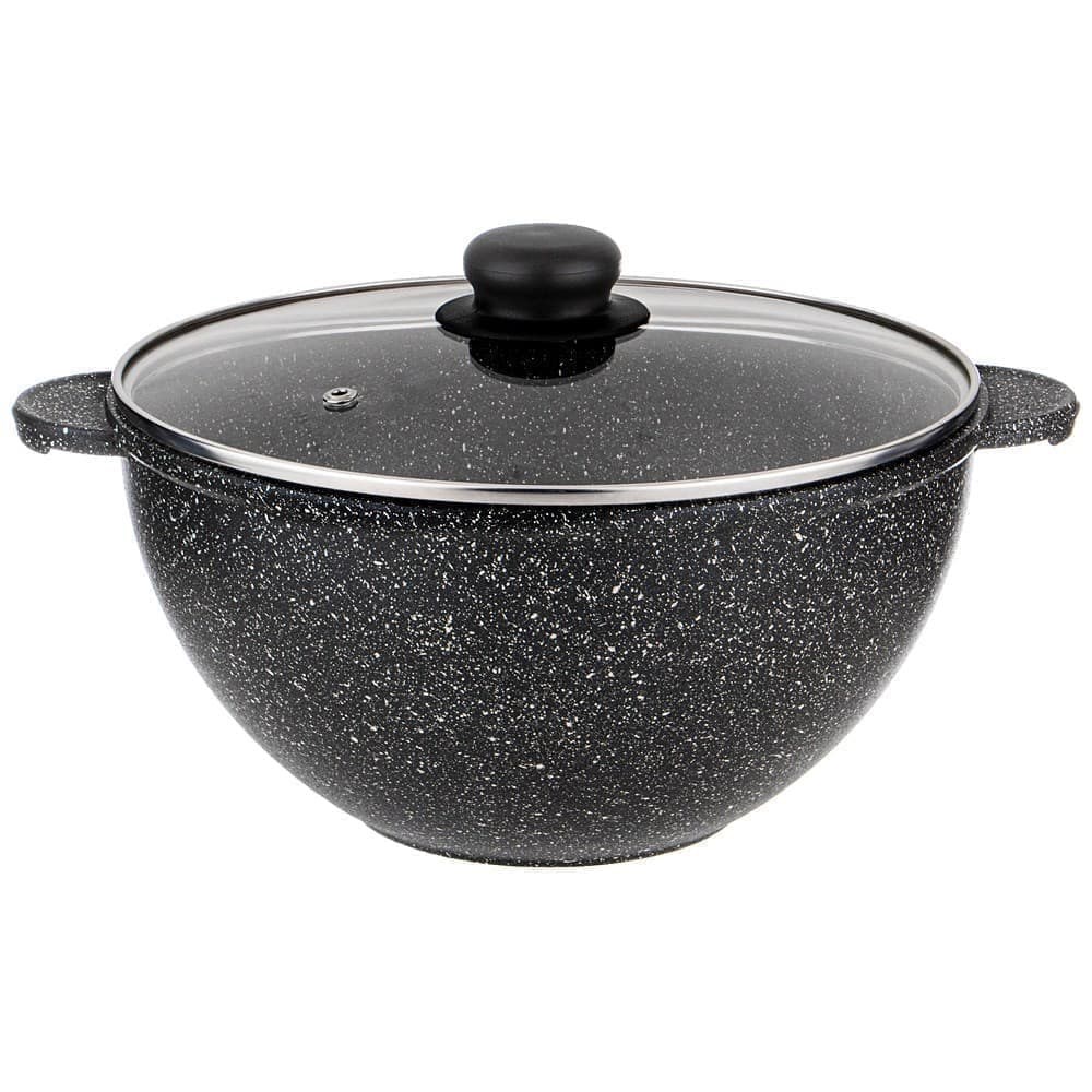 Казан с крышкой изготовлен из литого толстостенного алюминия и имеет ультрапрочное антипригарное покрытие ТМ PFLUON, главное преимущество которого - устойчивость к царапинам и износу. Также это покрытие абсолютно безопасно для человека, т.к. не содержит PFOA или других вредных веществ. Крышка изготовлена из жаропрочного стекла, имеет пароотвод и обод из нержавеющей стали. Правила использования: не нагревать посуду без продуктов; во время приготовления использовать деревянные или силиконовые кухонные принадлежности и прихватки; прежде, чем помещать посуду, в воду дайте ей остыть; не мыть посуду с применением абразивных или щелочных моющих средств, в ПММ мыть в режиме "Эко". В духовом шкафу можно использовать только без крышки и при температуре до 250 градусов. Подходит для всех видов варочных поверхностией, за исключением индукционных.