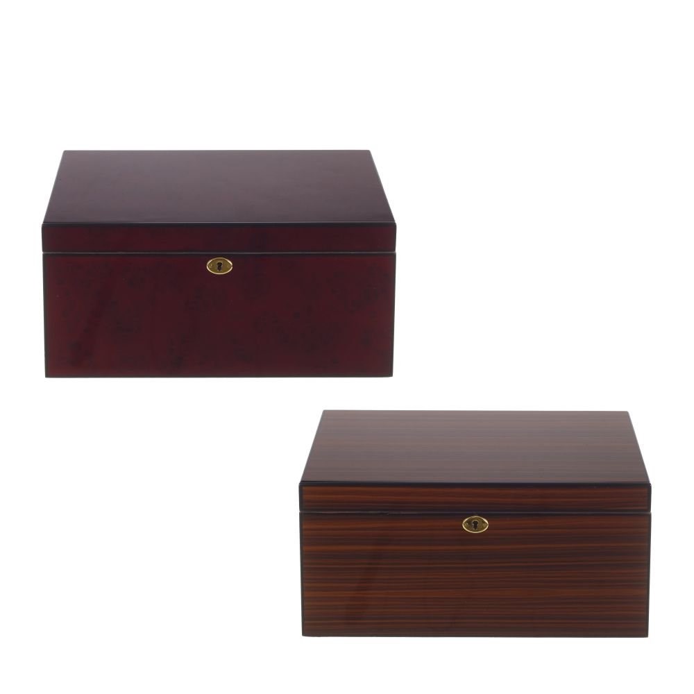 Хьюмидор деревянный, высокого качества, с богатой отделкой темно-красного цвета. Открывая хьюмидор, вы видите съемный лоток с перегородкой и нижнюю секцию с одним регулируемым разделителем. Содержит увлажнитель, гигрометр в золотистой рамке, гильотину для сигар, внутренний замок с ключом . Поддерживает идеальный уровень влажности и сохраняет вкус и аромат ваших любимых сигар. Вместимость: 92 сигары (формата Robusto). Представлен в двух вариантах.