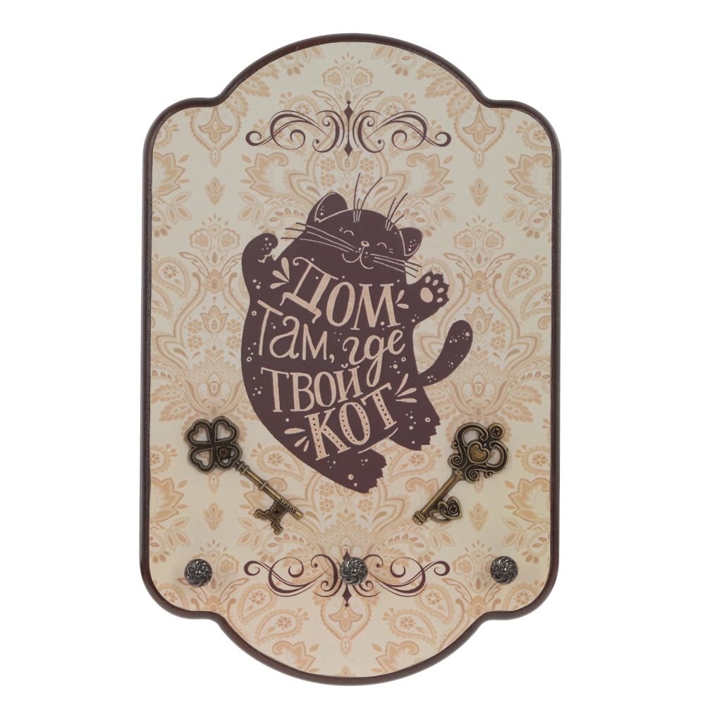 Ключница открытого типа с тремя крючками. Украшена изображением кошечки с надписью "Дом там, где твой кот" и декоративными металлическими элементами в виде ключей. Ключница – предмет не только красивый, но и функциональный, поэтому ей найдется место и в квартире, и в загородном доме.