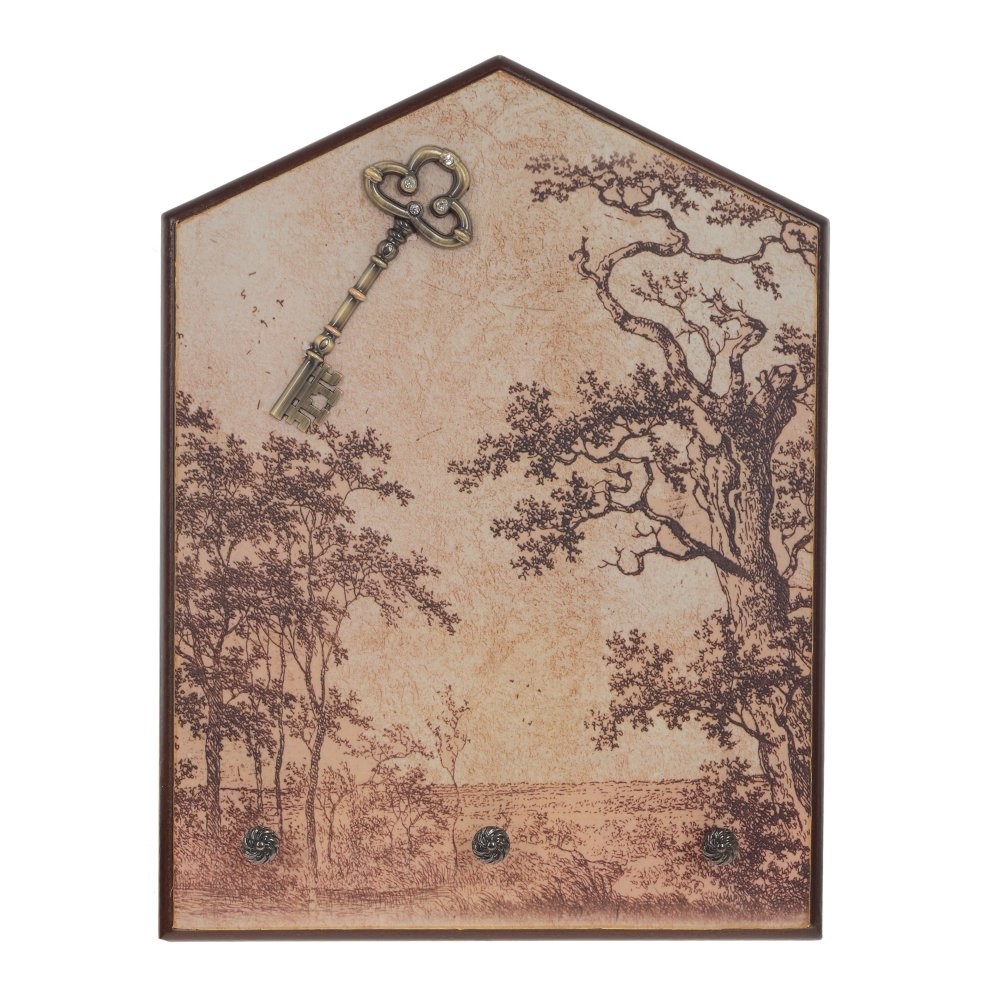 Ключница в форме домика открытого типа с тремя крючками. Украшена изображением осеннего пейзажа и металлическим декором в виде ключа. Ключница – предмет не только красивый, но и функциональный, поэтому ей найдется место и в квартире, и в загородном доме.