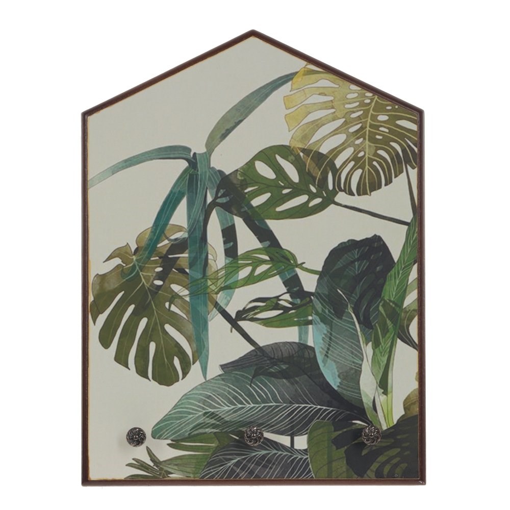 Ключница в форме домика открытого типа с тремя крючками. Украшена декором в виде тропических листьев . Ключница – предмет не только красивый, но и функциональный, поэтому ей найдется место и в квартире, и в загородном доме.