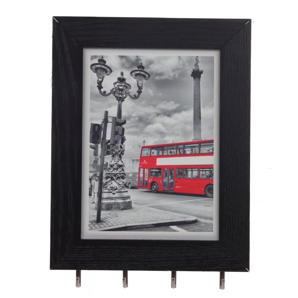 Ключница открытого типа с четырьмя крючками, изготовлена из МДФ. Цвет рамки - черный. Центральная часть с изображением Лондона. Крепится на стену с помощью двух металлических петелек.