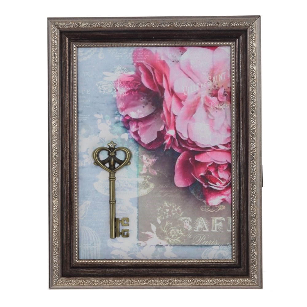 Стильная ключница для современного интерьера. Ключница закрытого типа с пятью крючками. Дверца с изображением цветов и декоративного металлического ключа. Закрывается сбоку на магнит. Ключница – предмет не только красивый, но и функциональный, поэтому ей найдется место и в офисе, и в квартире, и в загородном доме.