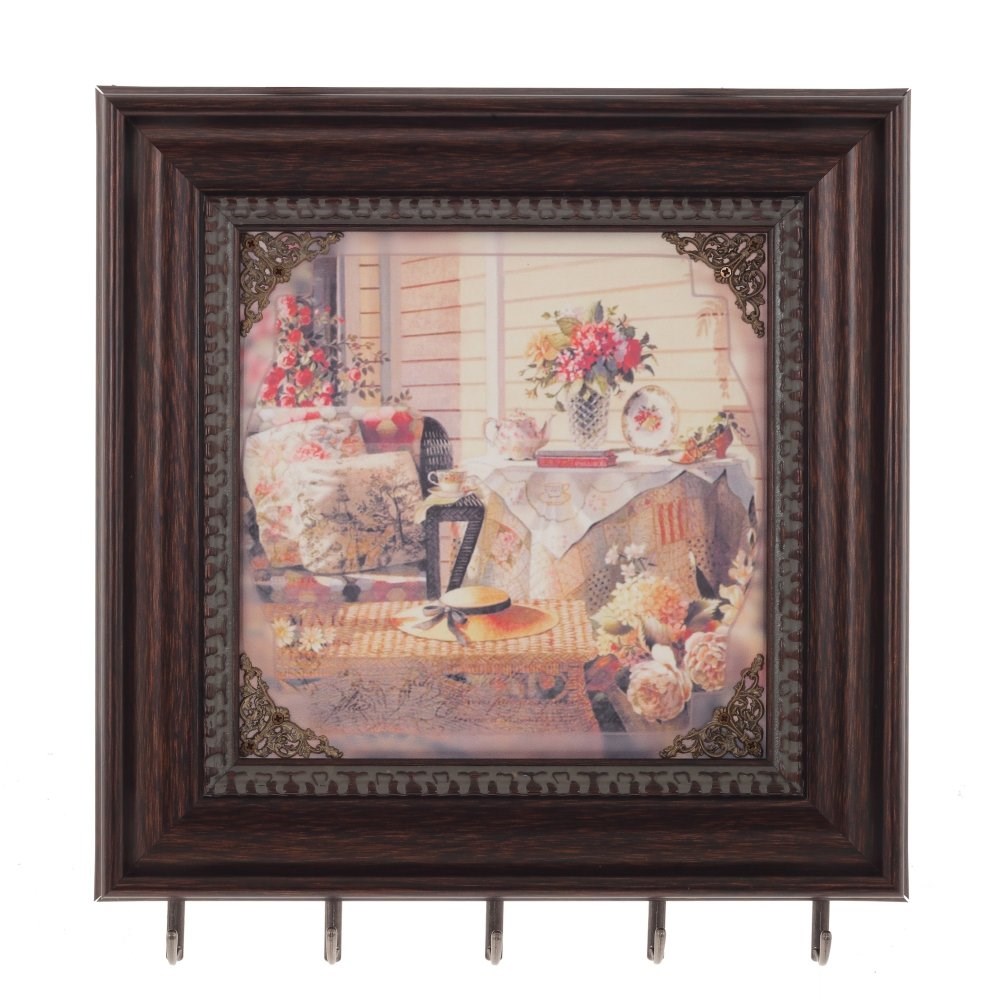 Стильная настенная ключница в багетной оправе открытого типа, с пятью металлическими крючками и изображением летней терассы. Декор - угловые ажурные элементы.. Это изделие не только красиво, но и функционально, поэтому оно прекрасно подойдет для квартиры и загородного дома.