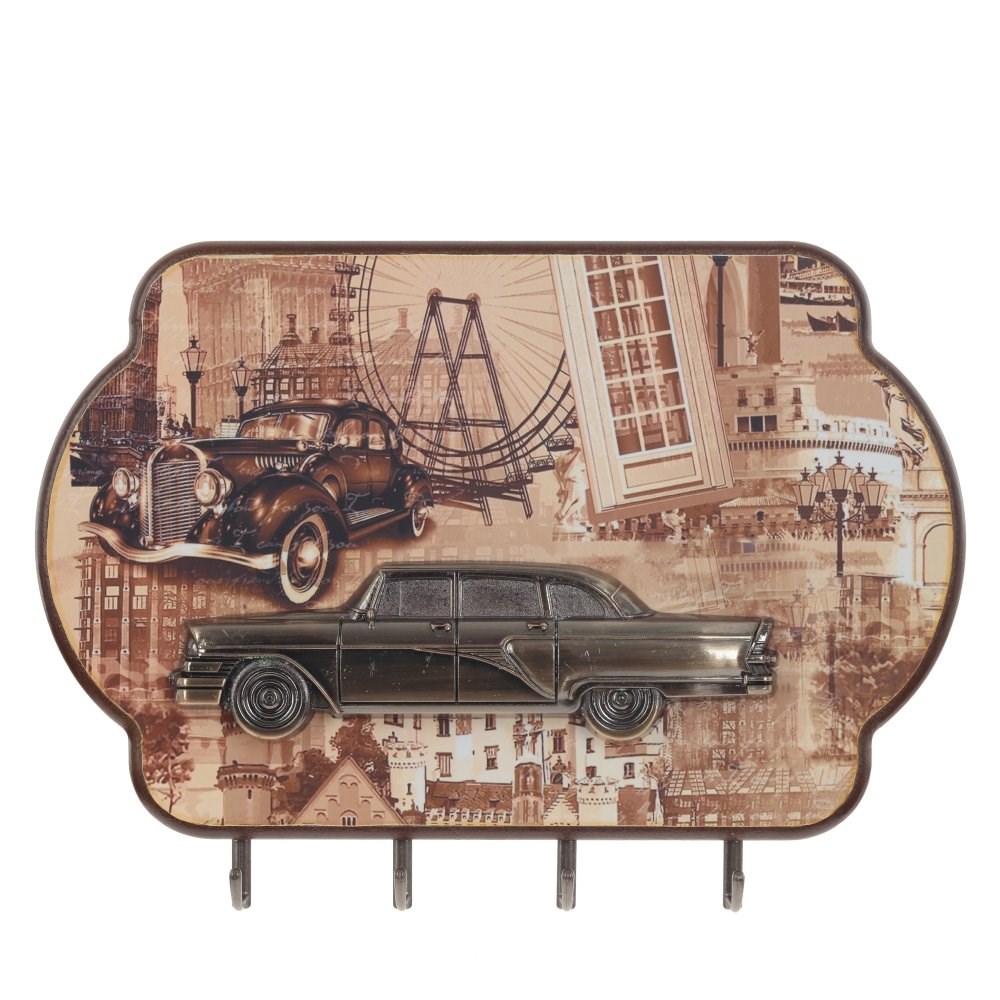 Ключница открытого типа с четырьмя крючками. Украшена декоративным металлическим элементом в виде автомобиля. Ключница – предмет не только красивый, но и функциональный, поэтому ей найдется место и в квартире, и в загородном доме.