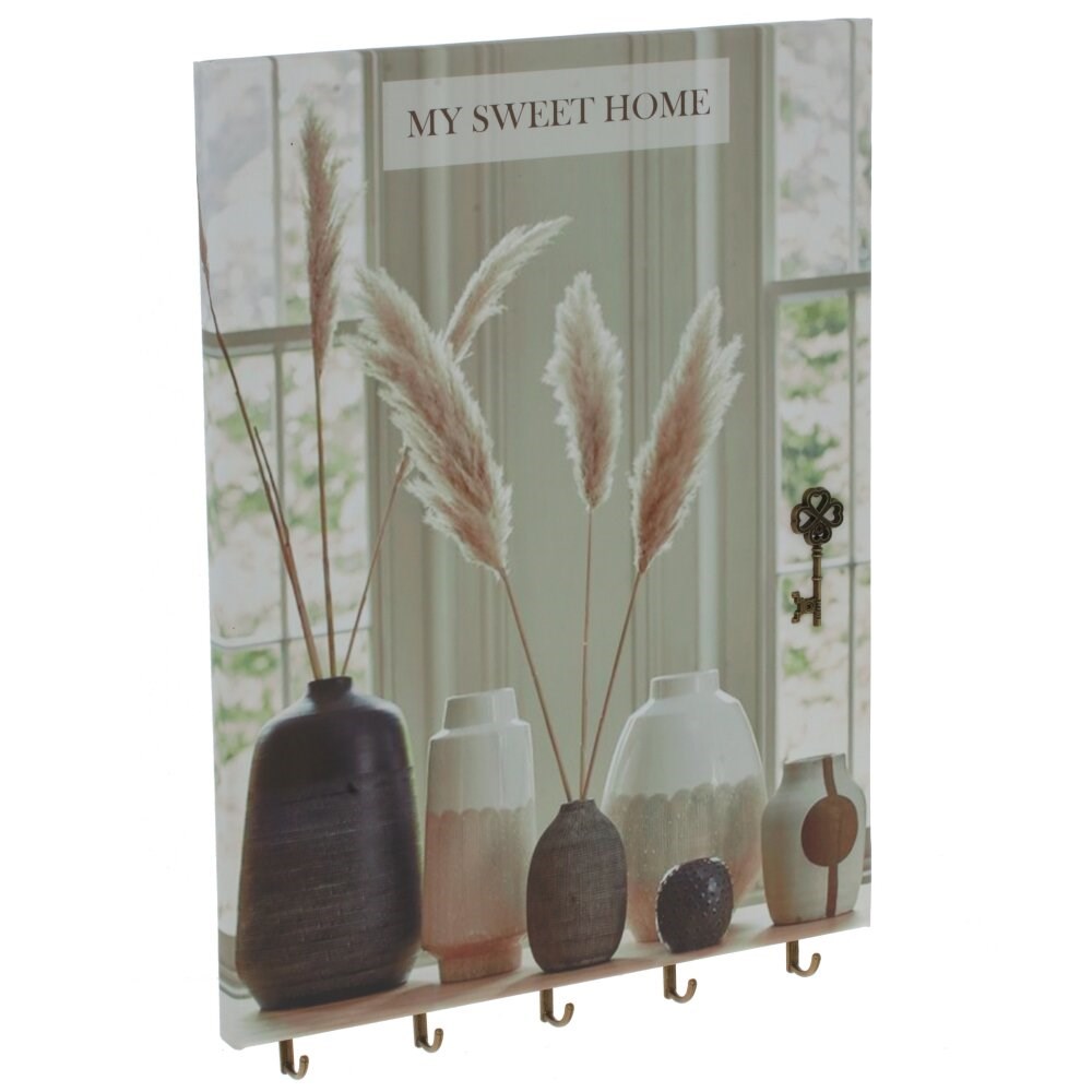 Ключница открытого типа с крючками. Украшена изображением в пастельных тонах и декоративным металлическим элементом в виде ключа. Ключница – предмет не только красивый, но и функциональный, поэтому ей найдется место и в квартире, и в загородном доме.