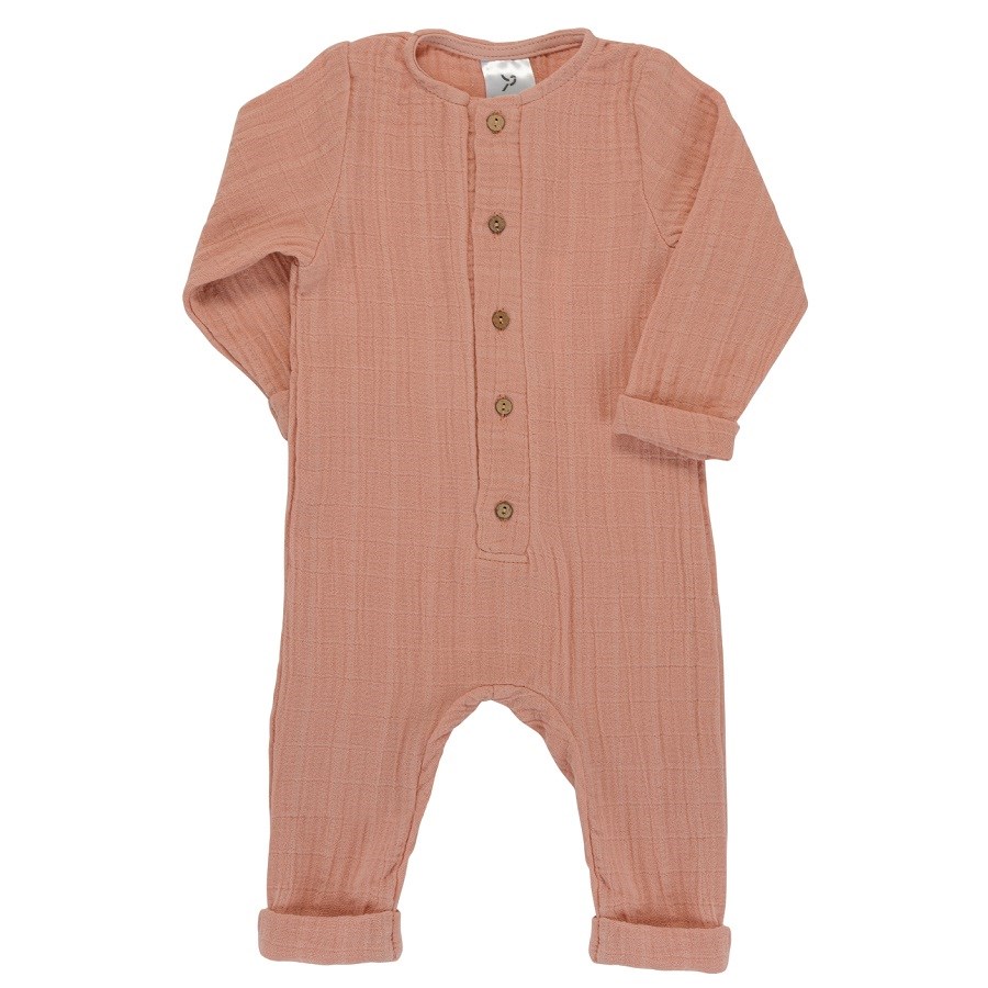 Комбинезон с длинным рукавом из хлопкового муслина цвета пыльной розы из коллекции Essential универсального дизайна и расцветки подойдет и мальчикам, и девочкам. Круглый вырез горловины и пуговицы спереди позволяют легко надевать и снимать комбинезон. Естественная фактура ткани практически не требует глажки.