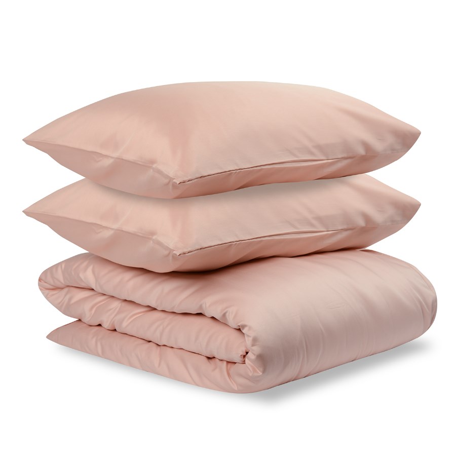 Пододеяльник и две наволочки 50х70 выполнены из плотного хлопкового сатина. Приятный на ощупь материал плотностью 210ТС хорошо пропускает воздух, обеспечивая коже комфорт в течение сна. Однотонный комплект представлен в оттенке пыльной розы.