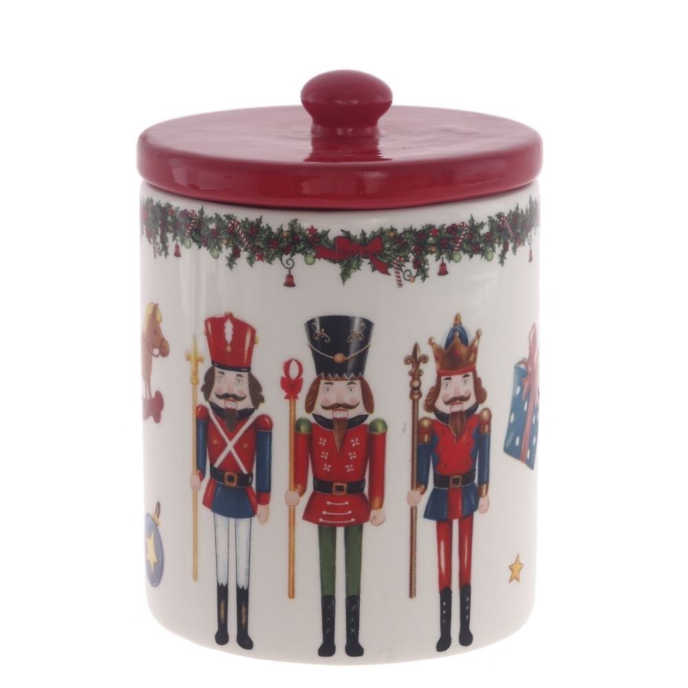 Конфетница с красной крышкой из коллекции "Щелкунчик" , изготовлена из керамики. Объем: 1000 мл, размер: L12 W12 H17 см.