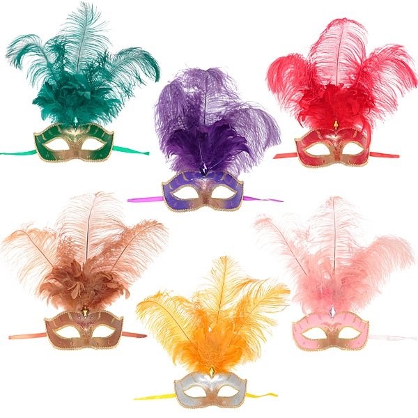 Украшение карнавальное, изготовлено из полимерных материалов и натуральных перьев, представлено в 6-ти вариантах цвета