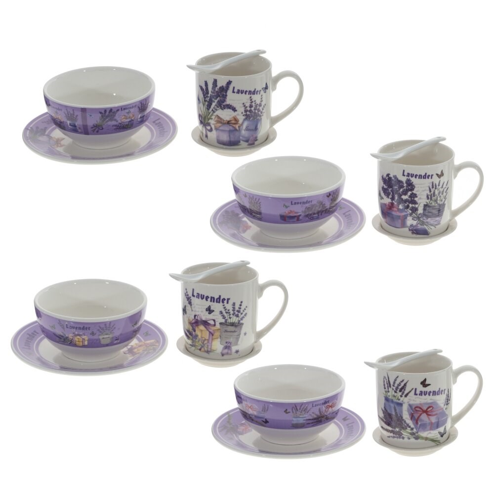 Красивая фарфоровая кружка. В комплект входит: кружка (12,5*8,5*9, 350 мл); блюдце (9,5*9,5*1,5); тарелка (17*17*2); бульонница (12*12*6,5, 400 мл); ложка. Такой набор - отличный подарок для ваших друзей и близких. Представлен в четырех вариантах.