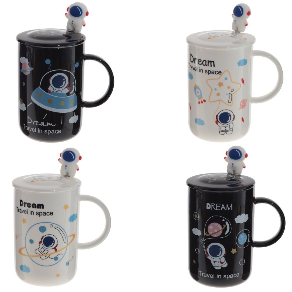 Фарфоровая кружка с интересным дизайном оптимального размера, объемом 400 мл., подойдет как для домашнего повседневного использования, так и для подарка родным и близким. Кружка снабжена фарфоровой крышкой и металлической ложечкой,украшенной фигуркой космонавта. Представлена в 4 вариантах