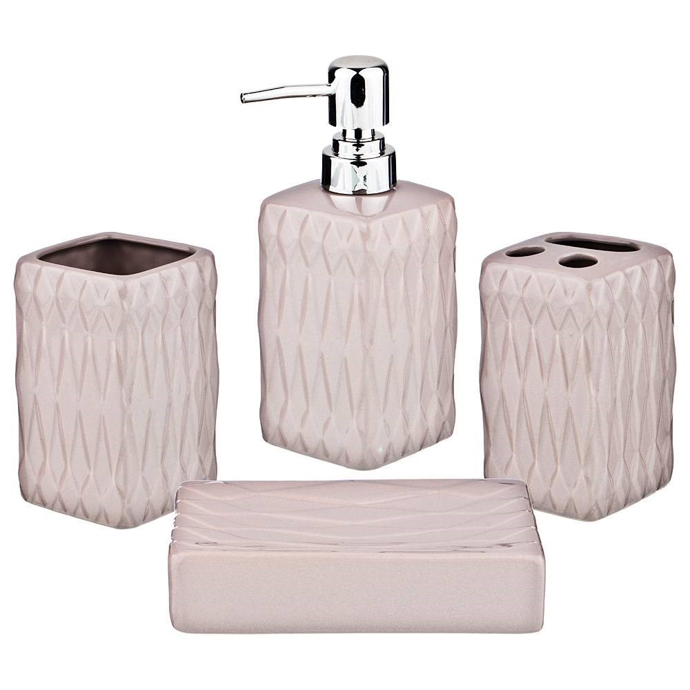 Набор аксессуаров для ванной комнаты состоит из дозатора для жидкого мыла, подставки-стакана, подставки для зубных щёток и мыльницы для кускового мыла.
