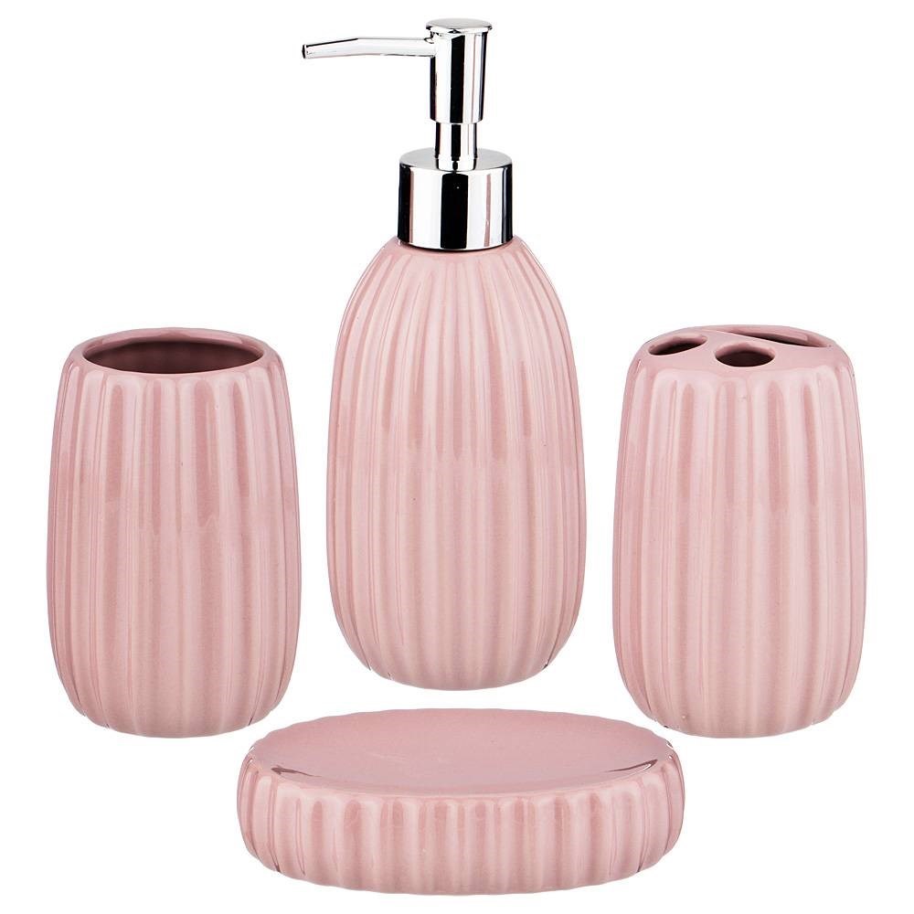 Набор аксессуаров для ванной комнаты состоит из дозатора для жидкого мыла, подставки-стакана, подставки для зубных щёток и мыльницы для кускового мыла.
