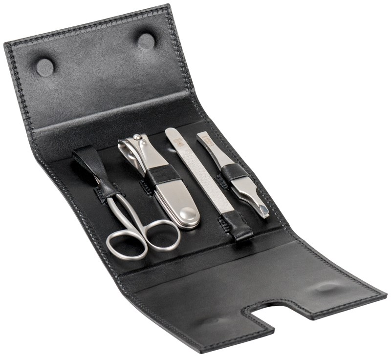 Маникюрный набор Dovo, 4пр. Инструменты: ножницы для кутикулы, пилка металл, пинцет наклонный, книпсер; покрытие матовое. Футляр: натур.кожа (вол), цвет черный