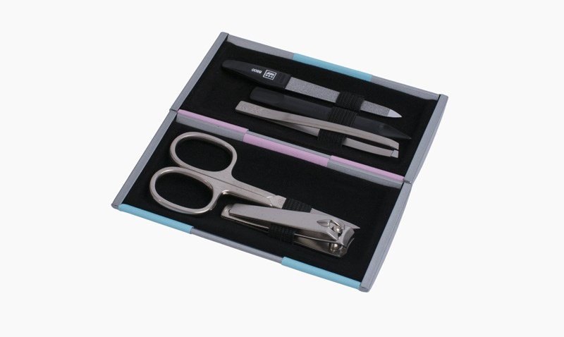 Маникюрный набор Yes, 5пр. Инструменты: ножницы для ногтей, книпсер, шабер пластик, пинцет наклонный, пилка металлическая. Футляр: металл, цвет серый/бирюзовый/розовый.
