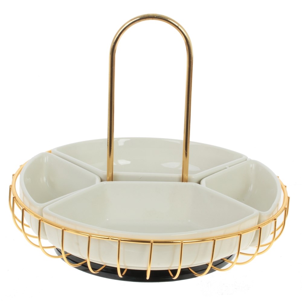 Приподнесите для своих гостей пирожные или фрукты на этой изящной и привлекательной менажнице. Фарфоровая тарелка расположена на металлическом основании с удобной ручкой для переноски. Такая менажница может стать центральным элементом вашего праздничного стола.