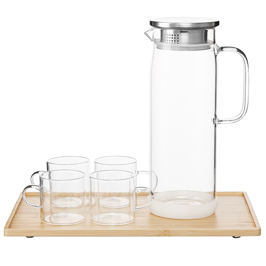 В набор входят 4 чашки, высокий чайник и поднос из бамбука 320х200 мм. Боросиликатное стекло выдерживает температуры от -70°С до 530°С, а также отличается высокой прочностью.