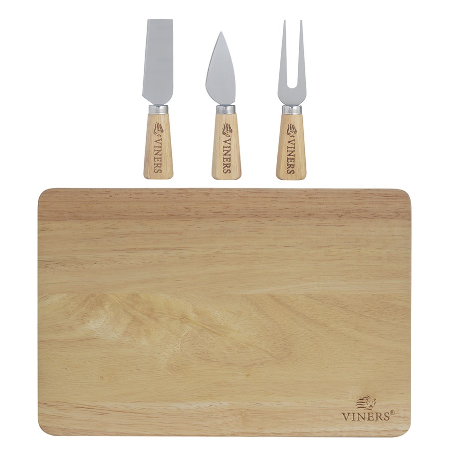 В комплект входят деревянная сервировочная доска 20 х 30 см, а также нож для жесткого сыра, нож для мягкого сыра и специальная вилка с двумя зубьями, выполненные из нержавеющей стали и оснащенные эргономичными деревянными ручками. Набор поставляется в подарочной упаковке.