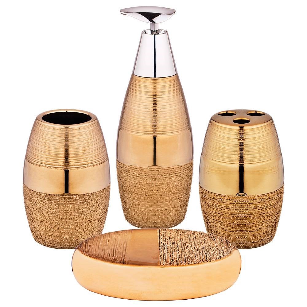 Набор аксессуаров для ванной комнаты состоит из дозатора для жидкого мыла, подставки-стакана, подставки для зубных щёток и мыльницы для кускового мыла.