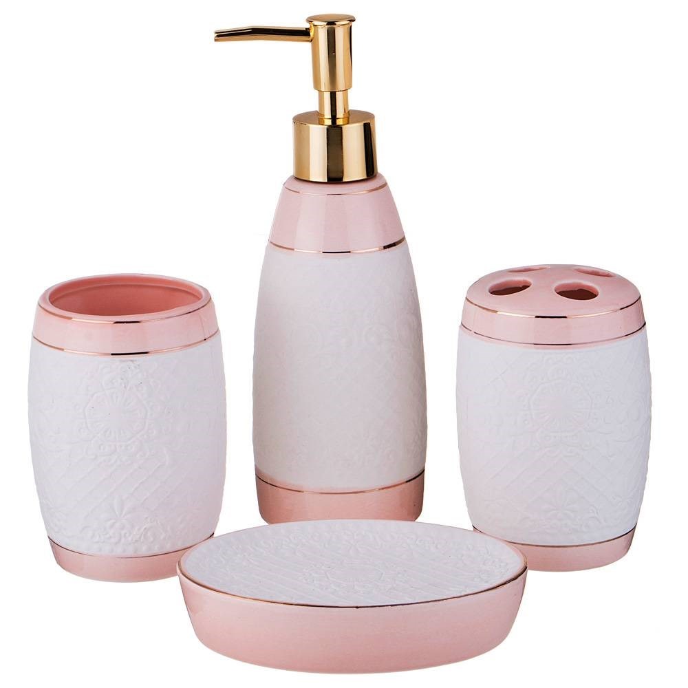 Набор аксессуаров для ванной комнаты состоит из дозатора для жидкого мыла, подставки-стакана, подставки для зубных щёток и мыльницы для кускового мыла.