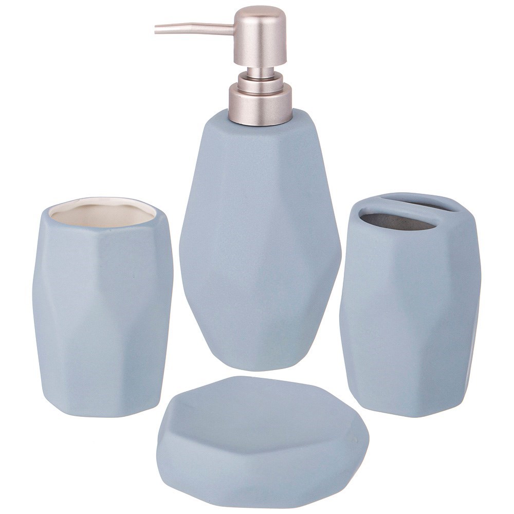 Набор аксессуаров для ванной комнаты состоит из дозатора для жидкого мыла, подставки-стакана, подставки для зубных щёток и мыльницы для кускового мыла.