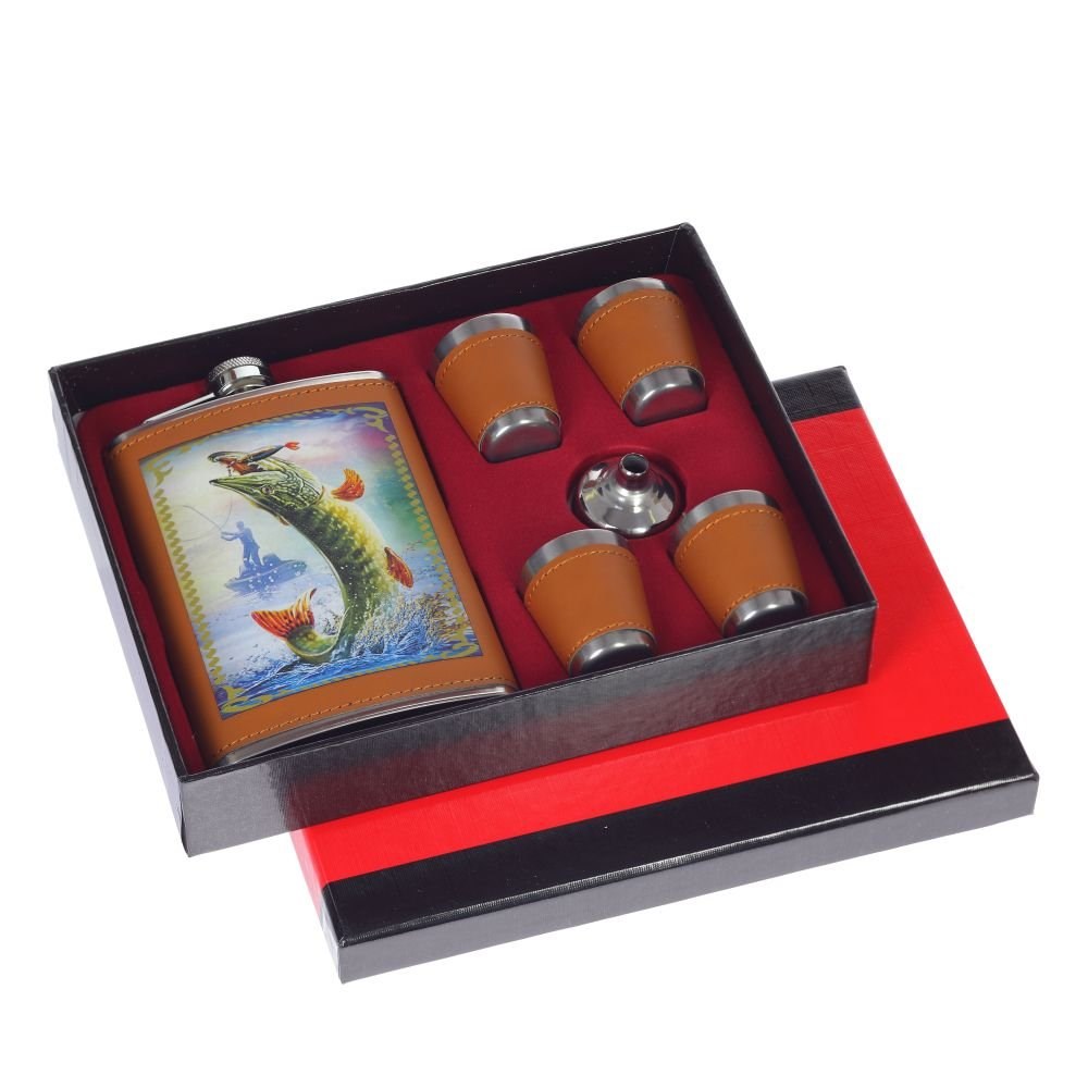 Набор из шести предметов: фляжка объем 250 мл, 4 стопки 30 мл, воронка. Изготовлен из коррозийной стали. Упакован в подарочную коробку. Такие наборы стали очень популярными подарками, подспудно напоминающими мужчинам об их славном походном прошлом.