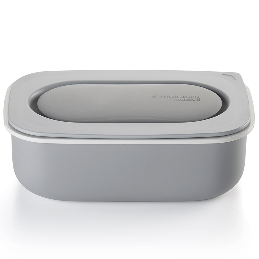 Ланч-бокс изготовлен из переработанного пластика. Материал не содержит токсинов и бисфенола-А. Клапан на крышке позволяет легко открывать и закрывать контейнер. Вилка и ложка размещаются в специальном съемном отсеке.