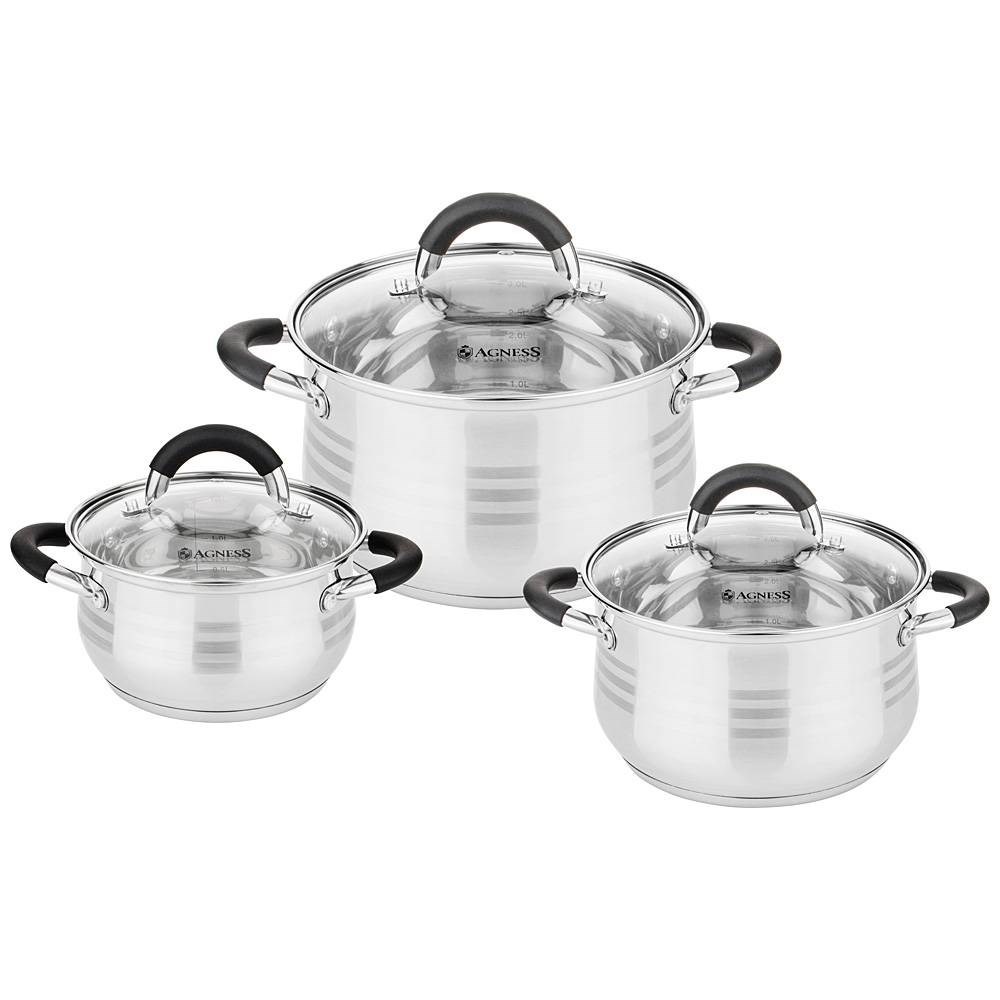 Набор кастрюль agness со стекл.крышками 6пр.1,7/2,6/3,5 л. размер 16x9,5/18x11,5/20x12.5 см