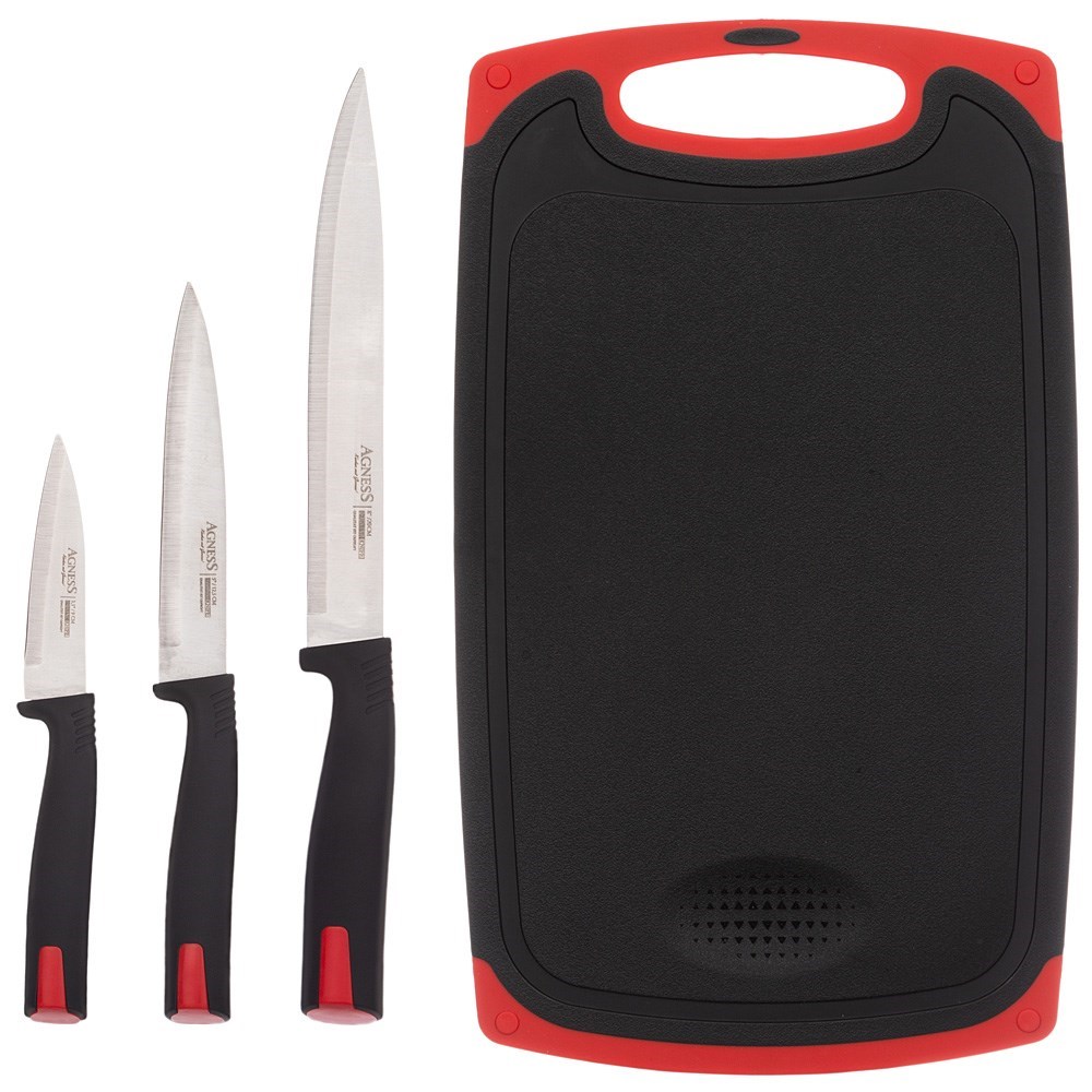 - Состав набора: Нож для нарезки 20см, Нож универсальный 12,5см, Нож для чистки овощей и фруктов, 9см, Пластиковая разделочная доска