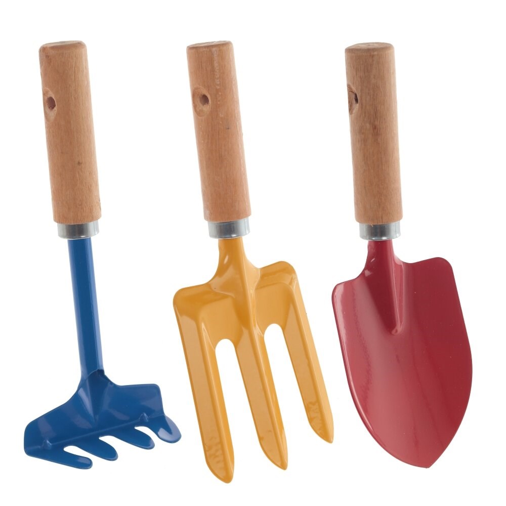 Набор садового инструмента из трех предметов. В набор входят: совок, вилка, грабельки. Металл с ярким покрытием. Удобная, не скользкая, деревянная рукоятка.